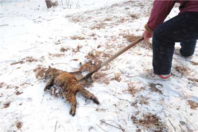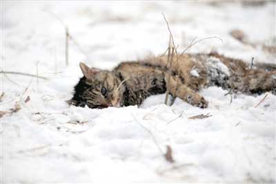 昨天清晨5點(diǎn)多,王阿姨在公園里又發(fā)現(xiàn)了一只被虐殺的流浪貓。王阿姨邊哭邊說,“前天傍晚我剛喂過它,沒想到今天就被人打死了!边@只被虐殺的流浪貓被王阿姨親切地叫做“小灰灰”,它兀自躺在公園東門附近的一處雪地上,腹部被殘忍地剖開,內(nèi)臟和肚腸依稀可見,毛上的血液早已凝固,但它的眼睛卻瞪得大大的。