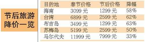 一路飆漲的旅游價(jià)格終于從今天開始大幅跳水。來(lái)自各大旅行社的報(bào)價(jià)顯示,與春節(jié)黃金周相比,即日起節(jié)后整體旅游價(jià)格下降三至四成,最高降幅超過(guò)六成。其中降幅最大的是春節(jié)期間漲至萬(wàn)余元的三亞酒店房?jī)r(jià),節(jié)后跳水將近八成。