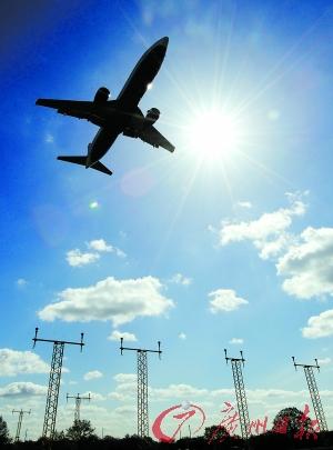 21日,一架飛機在倫敦希斯羅機場上空飛行。