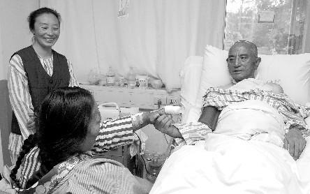 昨日下午3時11分,省醫(yī)院ICU。醫(yī)護人員聽說代吉卓瑪專門來看望丈夫昂文根德時,趕緊幫忙打開ICU的玻璃門。根德聽說妻子從華西醫(yī)院過來看他,坐在病床上急切地向門口張望。“現(xiàn)在感覺怎么樣?好多了吧?”輪椅上的卓瑪來到病床邊,緊緊地抓住丈夫的手輕聲問道?吹蕉嗳瘴匆姷钠拮,根德黝黑的臉上笑容燦爛。指指自己的喉嚨,豎起大拇指,又拼命地點頭。因為剛剛做過手術(shù),根德尚不能說話,他只能通過肢體語言告訴妻子,他很好。