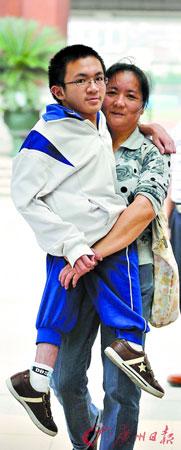 就讀于廣州市越秀外國語學(xué)校的高三男生勇仔(化名)的趕考路異于他人:媽媽推著輪椅,將他送到廣州市第三中學(xué)考場,接下來就由監(jiān)考老師接手。勇仔的試室在4樓,兩個壯年男老師一左一右抬起輪椅,將他護送到座位上。由于從出世以來就身患“成骨不全”,勇仔無法靠雙腿行走。從小學(xué)5年級至今,他能有機會參加高考,可以說全賴媽媽龔女士的懷抱。