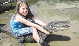 薩曼莎從小就在鱷魚群中長大,從6歲起,她就從自己的父親杰爾、母親艾琳那兒學(xué)會(huì)了如何和鱷魚摔跤、并將它們乖乖制服的藝術(shù)!薩曼莎接受記者采訪時(shí)說:“我從6歲開始就和鱷魚們摔跤了,我的父母教會(huì)了我如何將鱷魚制服的本領(lǐng)。我的父親在5歲時(shí)曾經(jīng)被鱷魚咬過一次,從那以后,他就學(xué)會(huì)了如何搏斗并制服兇猛的鱷魚。當(dāng)我一開始和鱷魚摔跤時(shí),我真有點(diǎn)兒害怕,不過我的父親一直在我身邊,他總是知道該如何對(duì)付它們。如果我面臨危險(xiǎn),他就會(huì)過來幫助我。”