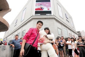 幸福的一對(后面大屏幕是張歌特意定做的畫面) 本組圖片 本報記者 車英 攝