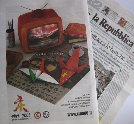 中新網10月3日電 據意大利《歐聯時報》報道,日前,在意大利佛羅倫薩學生學者聯誼會精心策劃下,中國國慶六十周年的宣傳廣告于10月1日被刊載在意大利共和國報紙上。廣告刊出后,引起了社會各界的高度關注,社會各界不約而同地把目光投向了中國,聚焦在中國60華誕的慶典活動。