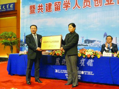 19日,山東省留學(xué)人員創(chuàng)業(yè)園建設(shè)現(xiàn)場(chǎng)會(huì)暨共建留學(xué)人員創(chuàng)業(yè)園授牌儀式在威海藍(lán)天賓館舉行。會(huì)上,山東省人力資源和社會(huì)保障廳向威海、濰坊和臨沂三市授予了共建留學(xué)人員創(chuàng)業(yè)園牌匾。據(jù)了解,“威海海外學(xué)人高科技創(chuàng)新園”由威海與32個(gè)留學(xué)人員團(tuán)體共同創(chuàng)建,留學(xué)人員已創(chuàng)辦企業(yè)38家。(圖為省人力資源和社會(huì)保障廳廳長董國勛向威海頒發(fā)共建牌匾)。(劉潔)