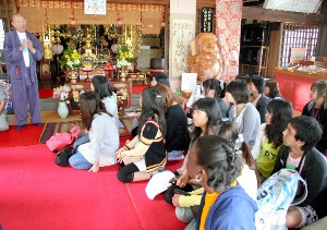 “四國(guó)大島心靈故鄉(xiāng)會(huì)”矢野都林會(huì)長(zhǎng)首先在村上水師的菩提寺和高龍寺(今治市吉海町名)迎接了大家,并給大家介紹了四國(guó)大島的基本情況;隨后,留學(xué)生們步行6公里,走訪(fǎng)了38所名剎;夜里,大家就寄宿在島上的民居旅館“善根驛站”,晚餐則品嘗到了島上志愿者親手制作的美味。