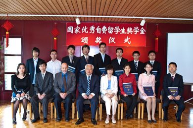 董大使首先向獲獎(jiǎng)?wù)吆退麄兊膶?dǎo)師及親人表示熱烈的祝賀,向留瑞學(xué)人表示親切的問候。他指出,設(shè)立“國(guó)家優(yōu)秀自費(fèi)留學(xué)生獎(jiǎng)學(xué)金”是新時(shí)期貫徹國(guó)家“支持留學(xué),鼓勵(lì)回國(guó),來去自由”留學(xué)工作方針的重要舉措,自2003年設(shè)立以來累計(jì)獲獎(jiǎng)人數(shù)已達(dá)1900余人。2009年度共497人獲獎(jiǎng),其中瑞士有15位在校博士生獲得這一殊榮。這是歷年來獲獎(jiǎng)人數(shù)最多的一次,顯示了在瑞士中國(guó)留學(xué)人員的實(shí)力和水平。