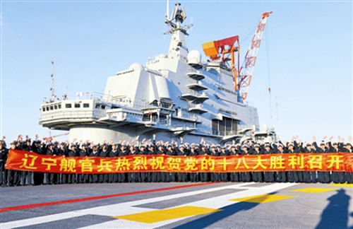 中新網(wǎng)11月8日電 據(jù)中國(guó)軍網(wǎng)海軍頻道報(bào)道,11月7日,我軍首艘航母、海軍“遼寧艦”上千名官兵展開鮮紅的彩色條幅,高聲歡呼,歡慶黨的十八大勝利召開。