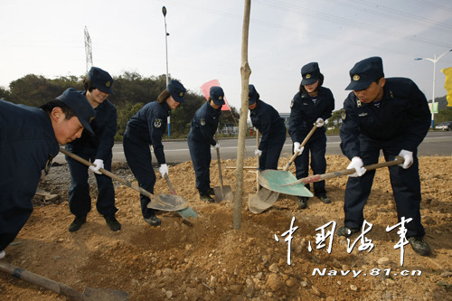 11月6日,東海艦隊某水警區(qū)20名官兵來到駐地經(jīng)濟開發(fā)區(qū)開展軍民秋季綠化植樹活動。寒風(fēng)中官兵們奮戰(zhàn)半個多小時,300顆左右的樹木挺立在荒蕪的土地上,頓時變得生機盎然起來。拍下身上的塵土,大家紛紛表示能在喜迎黨的十八大之際,為建設(shè)第二故鄉(xiāng)貢獻(xiàn)力量,很開心。