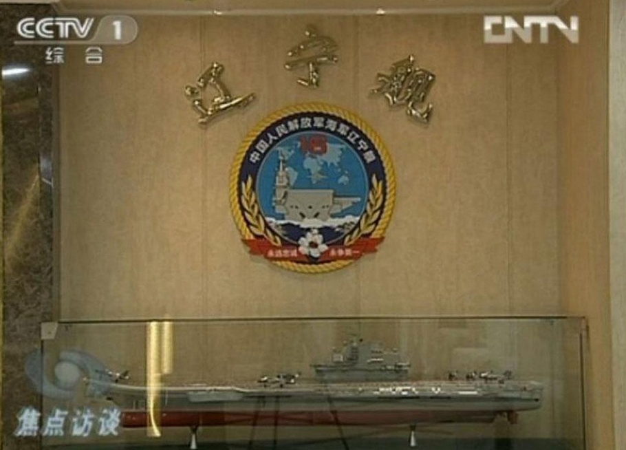 “遼寧艦”艦名與模型。(央視截圖)