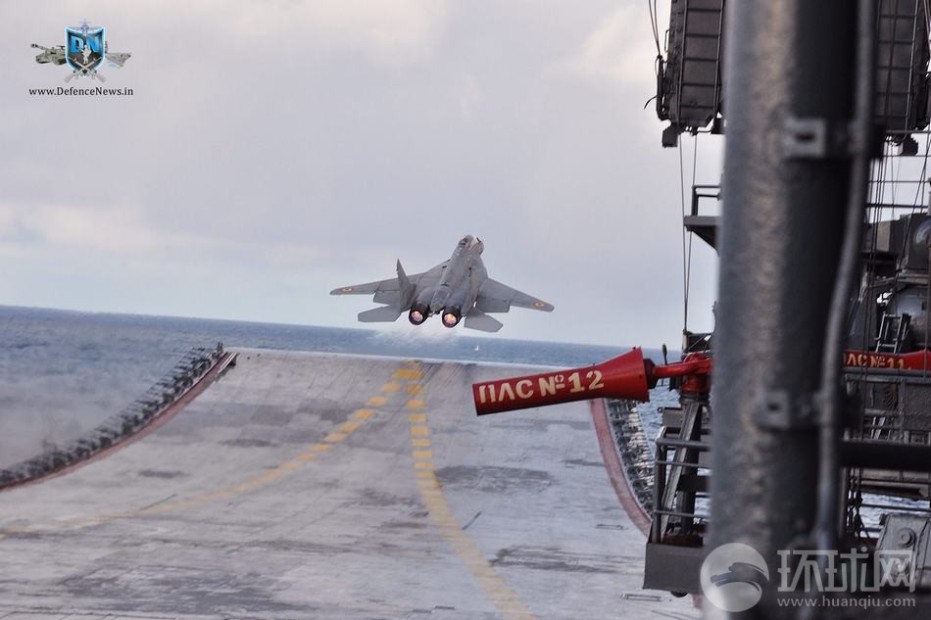 從甲板上拍攝到的艦載機(jī)在維克拉馬蒂亞號(hào)上起飛的場(chǎng)景