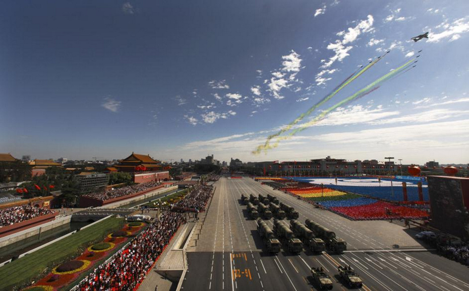 2009年10月1日,慶祝中華人民共和國(guó)成立60周年首都閱兵式上,多機(jī)編隊(duì)的領(lǐng)隊(duì)梯隊(duì)飛過天安門廣場(chǎng)。新華社記者 費(fèi)茂華 攝