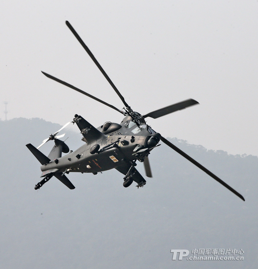 11月13日,我國(guó)自主研制生產(chǎn)的武直-10武裝直升機(jī)亮相在珠海舉行的第九屆中國(guó)國(guó)際航空航天博覽會(huì),在飛行表演中展示了這款直升機(jī)的優(yōu)良性能。圖為武直-10側(cè)旋。記者喬天富 攝