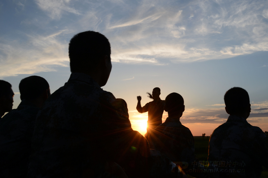 官兵在夕陽下學(xué)唱俄羅斯歌曲