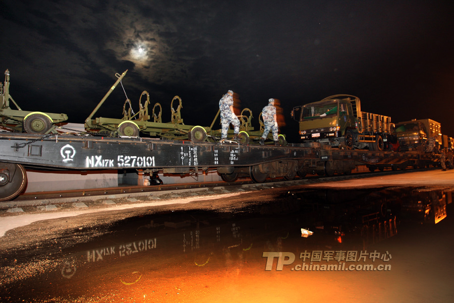 空軍戰(zhàn)斗群地轉(zhuǎn)人員,在黑水火車站冒雨進(jìn)行裝備重組,并對(duì)其備進(jìn)行加固。 曹占禮 攝