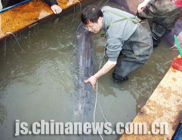 南京市一漁民于去年12月11日在長(zhǎng)江下關(guān)水域從事正常捕撈作業(yè)時(shí),無意中捕捉到這條長(zhǎng)3.3米、重量在130公斤左右的國家一級(jí)保護(hù)動(dòng)物——白鱘。當(dāng)時(shí)這條呈灰白色的白鱘已多處受傷。