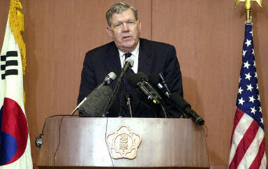 據(jù)“中央社”報(bào)道,凱利以美國(guó)布什總統(tǒng)的特使身份訪問漢城,在會(huì)見韓國(guó)總統(tǒng)當(dāng)選人盧武鉉之后,在漢城外交部舉行新聞發(fā)布會(huì)。