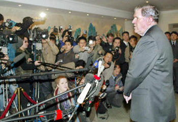 關(guān)于朝核問(wèn)題,李肇星說(shuō),中方堅(jiān)持維護(hù)朝鮮半島的和平與穩(wěn)定,支持朝鮮半島實(shí)現(xiàn)無(wú)核化,不贊成在半島上出現(xiàn)核武器,主張通過(guò)對(duì)話和平解決問(wèn)題。中方不贊成朝方退出《不擴(kuò)散核武器條約》(NPT)。