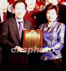 由中國國務院僑辦經濟科技司司長吳洪芹(右)率領的中國經濟科技考察團,一月十五日抵美后即前往紐約華埠,向紐約僑胞拜年。紐約華人社團聯合總會主席梁冠軍(左)代表紐約僑界向代表團贈送了“鋪經貿橋梁、謀科技騰飛”的牌匾。作者:趙海燕