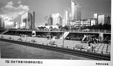 為了達到良好的觀水效果,規(guī)劃海河兩岸原則上不設(shè)獨立防洪墻,根據(jù)不同地段的地形、地貌及開發(fā)建設(shè)要求,在不影響外觀及功能的前提下,采用建筑物底層外墻結(jié)合防洪要求,或在不影響交通的前提下,局部抬高路面或設(shè)置觀水平臺,并通過現(xiàn)代化防洪調(diào)度、分流等措施,確保城市防洪、排瀝安全。