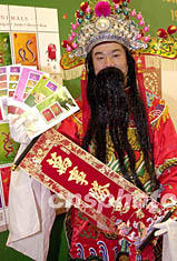 香港郵政署1月19日發(fā)行十二生肖(羊年)特別郵票,郵政署邀請(qǐng)財(cái)神展示羊年特別郵票首日封,并祝市民萬事勝意。鄧慶樂 攝