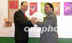 香港郵政署1月19日發(fā)行十二生肖(羊年)特別郵票,香港郵政署長(zhǎng)陸炳泉及民政事務(wù)局局長(zhǎng)何志平(右)在巨型首日封上蓋印,象徵郵票正式發(fā)行。鄧慶樂 攝