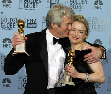 中新網(wǎng)1月20日電 由好萊塢外國記者協(xié)會主辦的第六十屆金球獎?lì)C獎典禮當(dāng)?shù)貢r(shí)間19日晚登場,八項(xiàng)入圍遙遙領(lǐng)先的《芝加哥》獲音樂或喜劇類最佳影片,李察吉爾與蕾妮齊薇格也雙雙勇奪音樂或喜劇類最佳男、女主角。妮可基嫚的《時(shí)時(shí)刻刻》則獲劇情類最佳影片、劇情類最佳女主角。