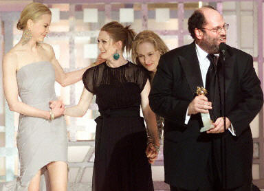 圖為《時時刻刻》獲得金球獎劇情類最佳電影獎,從左至右為:妮可·基德曼、茱麗安·摩爾、梅麗爾·斯特里普與制片人斯科特陸丁。