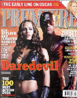 據(jù)臺(tái)灣媒體報(bào)道,耗資一億美金、改編自Marvel暢銷漫畫的《夜魔俠》,由班艾佛列克及金獎(jiǎng)影后珍妮佛嘉納,分飾片中靈魂人物夜魔俠及伊萊莎。除了媲美《蜘蛛人》的視效動(dòng)作,片中男女主角感情的糾結(jié),更可媲美《英雄》里的殘劍飛雪,這對(duì)漫畫世界里愛得辛苦,卻也天地可表的戀人,搬上大銀幕將如何詮釋,早已掀起熱門話題。不僅全美檔期刻意安排在情人節(jié)上片,班艾佛列克和珍妮佛嘉納兩人更以緊身衣造型相繼入鏡,榮登二月號(hào)《首映雜志》的封面照,這是《首映雜志》繼二00一年十一月《哈利波特:神秘的魔法石》后,再度讓封面人物以戲服登場,雜志內(nèi)文還以八頁超大篇幅完整介紹,不僅印證了暢銷漫畫《夜魔俠》的人氣和辨識(shí)度,也令這部電影備受矚目。