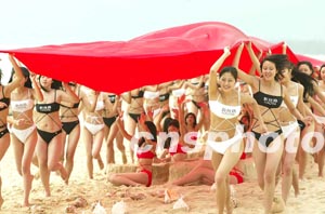 二百零三名模特佳麗二十二日在海南三亞亞龍灣參加“三亞與美麗同行活動(dòng)”,手持紅色綢帶向全國人民拜大年。作者:毛建軍