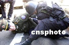 在東四十條橋西側(cè)200米處,3輛警車停放在路中間擋住去路,地面上橫著一排道釘。面對荷槍實(shí)彈的民警,“劫持者”終于放棄了抵抗,停下車后,依次跳下車來束手就擒。特警們沖上前去,干凈利落的擒拿動作令周圍不明所以的行人誤以為真的發(fā)生了搶劫案。
