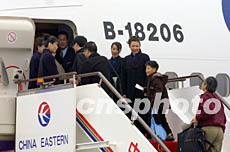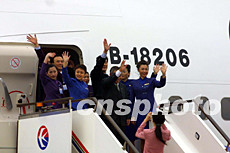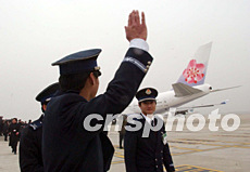 載有春節(jié)返鄉(xiāng)探親臺(tái)商及其眷屬的臺(tái)灣“華航”包機(jī),一月二十六日上午十一時(shí)三十分左右從上海浦東機(jī)場(chǎng)順利起飛。圖為“華航”機(jī)組人員起飛前揮手作別。
