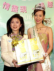 「2003年度國(guó)際華裔小姐競(jìng)選」獲獎(jiǎng)佳麗1月26日在香港出席贊助商頒獎(jiǎng)儀式,應(yīng)屆國(guó)際華裔小姐冠軍陳泳錦接受贊助商頒贈(zèng)禮品。