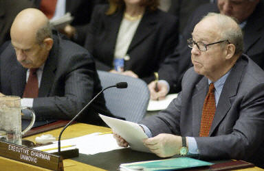 聯(lián)合國監(jiān)核視委主席布利克斯(右)和國際原子能機構總干事巴拉迪向聯(lián)合國安理會匯報對伊武器核察工作情況。