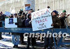 一月二十七日聯(lián)合國武器監(jiān)測、核查和視察委員會主席布利克斯和國際原子能機構總干事巴拉迪向安理會提交對伊武器核查報告,與此同時,聯(lián)合國大樓外近百名反戰(zhàn)人士舉著反戰(zhàn)標語高喊“不要戰(zhàn)爭”,反對美國對伊開戰(zhàn)。作者:趙海燕