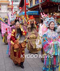 據(jù)日本共同社報道,扮演楊貴妃和三國時代人物的市民們身著各色衣裝走在街上,這是將從農(nóng)歷除夕31日開始的“南京町春節(jié)慶典”的預(yù)演。在鼓聲和銅鑼聲中,中國明朝的皇帝迎面走來,隨后是劉備、呂布、關(guān)羽等三國英雄,表演使得觀光游客大飽眼福。