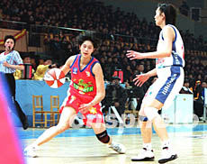 一月二十八日晚,2003中國(guó)女籃WCBA全明星賽在河北省秦皇島市奧體中心開賽,八一隊(duì)隊(duì)員隋菲菲(左)第二次獲得聯(lián)賽最有價(jià)值球員稱號(hào)。作者:廖文靜