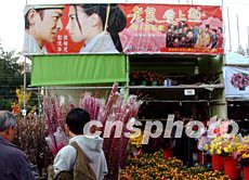 在人流多的香港維園年宵市場,港產(chǎn)電影“老鼠愛上貓”為加強(qiáng)宣傳,在花檔高高掛上宣傳海報(bào)。鄧慶樂 攝