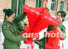 三十日,駐閩某部文藝連營(yíng)房處處張燈結(jié)彩,一派春意盎然的景象,喜迎羊年新春。圖為今年首次在軍營(yíng)歡度春節(jié)的女兵將大紅燈籠高高掛起。作者:劉可耕
