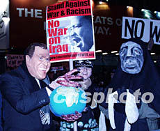 當(dāng)?shù)貢r(shí)間二月五日,在鮑威爾向聯(lián)合國(guó)提交伊拉克擁有大規(guī)模殺傷性武器新證據(jù)的同時(shí),數(shù)百人在紐約時(shí)代廣場(chǎng)集會(huì),反對(duì)美國(guó)對(duì)伊拉克開戰(zhàn)。傍晚時(shí),越來(lái)越多下班的紐約人自動(dòng)加入,集會(huì)遂演變?yōu)檠刂氖中羞M(jìn)的反戰(zhàn)示威游行。圖為帶著布什面具的示威者。作者:龔文謨