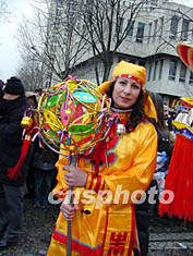法國華人社團(tuán)新春聯(lián)合組織的盛大彩妝巡游在巴黎十三區(qū)舉行,法國人和華人一道歡天喜地慶新春。圖為舞龍隊(duì)的女指揮。作者:蔚中