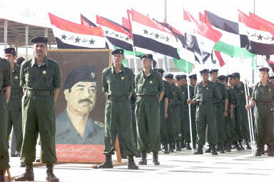 在一個插滿稱贊薩達姆的旗幟的體育場上,許多貴賓和學(xué)生在觀看數(shù)萬名軍人照著軍樂隊的節(jié)拍列隊行進,時間達兩個多小時。這些士兵一面行進,一面揮舞各式武器,其中包括步槍和火箭筒。
