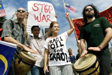而在亞洲及澳洲,一些國家今日已展開反戰(zhàn)示威游行,泰國、馬來西亞及新西蘭等國均有示威活動。在泰國有大約3000人上街示威,高喊反戰(zhàn)口號,而新西蘭有數以萬計的示威者走上上街頭反對美對伊開戰(zhàn)。