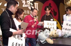 劇中藝員歐錦棠、滕麗名、佘詩(shī)曼、歐陽(yáng)震華(左起)于會(huì)上以口代手寫上"冤"字比拼,場(chǎng)面搞笑。