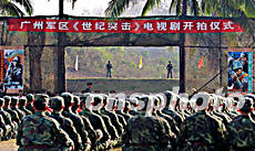 中國第一部全方位表現(xiàn)解放軍參加國際偵察兵軍事技能大比武的電視連續(xù)劇《世紀(jì)突擊》,二月二十二日在海南五指山某軍事基地開拍。圖為壯觀的開拍儀式。作者:古月