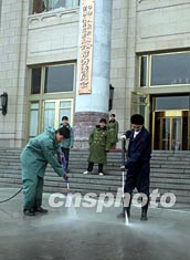 工作人員二十三日在北京人民大會(huì)堂門外清理地面灰塵,迎接將于三月初召開的第十屆全國(guó)人民代表大會(huì)與全國(guó)政協(xié)十屆會(huì)議。作者:毛建軍