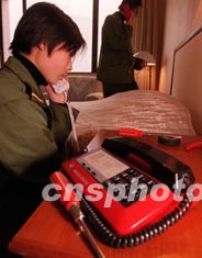 北京保障京西賓館通信的解放軍女兵,目前正在緊張檢修電話,以確保參加中國人大和政協(xié)“兩會(huì)”的代表、委員通信萬無一失。作者:宋吉河