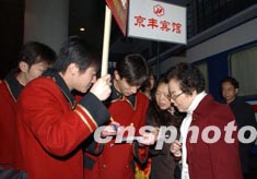 從二月二十七日早上開(kāi)始,參加全國(guó)政協(xié)會(huì)議的委員陸續(xù)抵達(dá)北京。早上七時(shí)許,賓館工作人員在北京西站迎接來(lái)自湖北的政協(xié)委員。作者:張煒