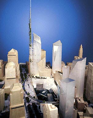 美國建筑師丹尼爾·利貝金斯德準(zhǔn)備在紐約世貿(mào)中心廢墟上,興建532.8米的世界最高尖塔大樓的構(gòu)想,26日獲得評(píng)選人員的青睞。
