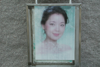 公園內還有小憩之地,游人可以在這里邊休息邊聽鄧麗君的歌曲。小憩之地在廣場的旁邊,有石桌、石凳,是一個露天棚的形狀,上面是樹枝垂伏。這里最引人注意的是,石座中間有一副鄧麗君的照片,是少女時代的模樣,這樣的安排,仿佛鄧麗君就坐在你身邊,和你坐在一起談心。照片是彩色的,鄧麗君青春煥發(fā),光彩奪人。照片裝在一個鏡框中,周圍有點發(fā)黑和發(fā)黃,似乎有些陳舊,可能已經保存相當長的時間了。